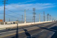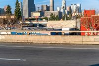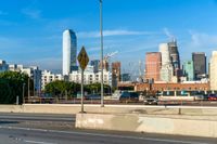 A view of the Los Angeles skyline illuminated by the morning sun, with a split-rail fence, Armco barrier, and a traffic sign providing a sense of safety and security in the modern urban environment.