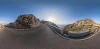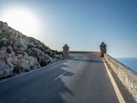 A guard rail of an Armco Barrier, made of asphalt, stretches across the landscape of the Balearic Islands, Mallorca, Spain. The clear sky allows for the sun and its hard shadow to be visible.