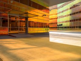 A mixed-use building in the Netherlands with a clear sky and a beautiful sun visible. The building's facade features an orange, brickwork pattern with metal fixtures, providing a unique and modern architecture to the area.