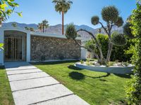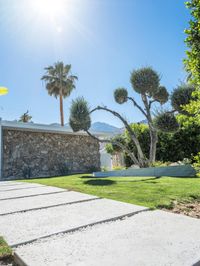 A lush suburban landscape in Palm Springs, California, USA featuring modern architecture, a concrete path, a villa, and a garden with palm trees, all illuminated by the bright sunshine of a clear sky.