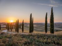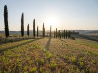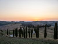 A winding gravel road stretches through a rugged Tuscan landscape, lined with cypress trees and gardens full of harvest. The sun is visible and the clear sky promises a sunny day ahead.