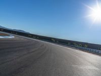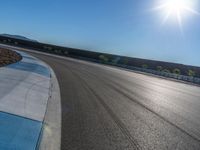 A curve in the road of a race track on a sunny day in the USA, with a clear sky and asphalt visible.