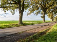 A lush and green landscape of Berlin, Germany is seen from a sunlit road. The clear blue sky and tar road surface are lined with a fence, trees, and vegetation, with incidental people walking in the distance.