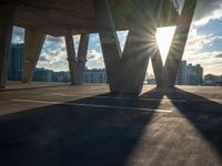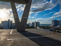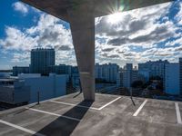 A top down view of the city of Miami Beach, Florida, USA. The sunny skyline featuring skyscrapers, concrete and open spaces can be seen from this elevated position. The hard shadows of the cloud and parking lot surface are visible in the day light.