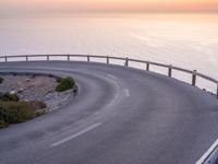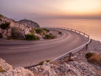 On the Curved Road of the Balearic Islands, the Armco Barrier Guard Rail Stands against the Nature of the Coastal Landscape and the Early Morning Sun Visible on the Ocean Water.