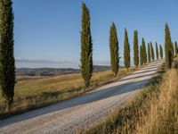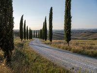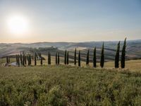 The sun is visible over the rugged landscape of Tuscany, Italy - the dirt road winding through the open space lined with cypress trees and gardens ready for harvest in the clear sky of a new sunny day.