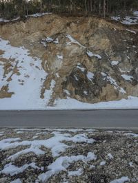 The break of day reveals a stunning winter landscape of snow-covered mountains, rugged cliffs, and icy rock walls in Shangri-La, Yunnan, China. In the foreground, a winding road of asphalt leads through the wild and glacial tundra, showcasing the coastal lowlands and glacial soil of the Asian continent.