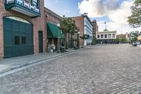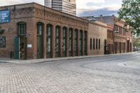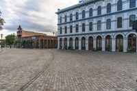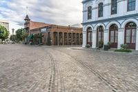 The city of Los Angeles, USA is illuminated by the rising sun at dawn, revealing classic architecture, cobble stone surfaces, open plazas, and restaurants ready for patrons to eat out in the Californian city.