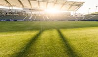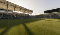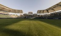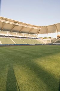 A stunning dawn view of a residential area in Los Angeles, California, USA. A grass surface and clear sky are visible, along with a soccer stadium in the background. This urban and suburban landscape is a hot spot for sports like soccer and Olympic games, with the LA Galaxy team playing nearby.