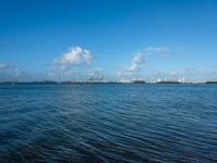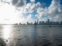 The sky is changing from the dark of the night to the bright of a new day in Miami Beach, Florida, USA. The sun is visible, reflecting off the water and highlighting the city skyline with its skyscrapers, urban design, and city life.