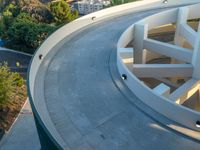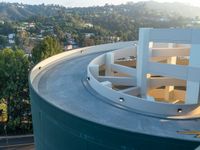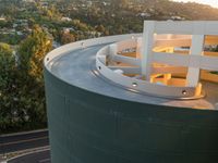 A top-down view of a residential parking deck in Los Angeles, USA, illuminated by the first rays of the sun as the dawn slowly breaks.