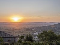 The sun rises over the picturesque landscape of Tuscany, Italy, casting a warm golden glow over the charming village nestled among rolling hills, trees, and gardens. The clear sky and visible sun create a serene atmosphere, offering an idyllic view of this European countryside.