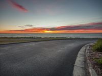 A beautiful view of a coastal road at sunset, with the afterglow reflecting on the road surface and the surrounding vegetation.