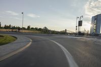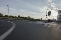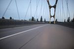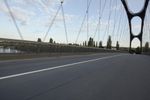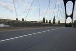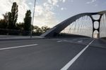 A road trip through Frankfurt, Germany on a beautiful sunny day. The road is lined with an arch bridge, cable-stayed bridge, and an extradosed bridge, and is filled with pedestrians, cyclists, and motor vehicles. The horizon is filled with clouds and contrails, and the street is lined with a crosswalk and zebra crossing.
