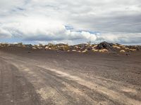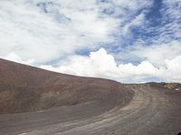 A winding road runs through a surreal landscape of sand, dirt, asphalt, grass, and trees beneath cumulus clouds, illuminated by the warm sun. The terrain of the highland plain features a variety of mountain landforms, vegetation, and other formations.
