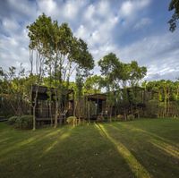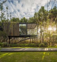 A beautiful villa surrounded by lush vegetation and green grass surface in Suzhou, China. The sun shines brightly, illuminating the path to this stunning residential property, offering a perfect blend of nature and architecture.