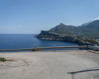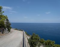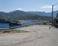 Aerial view of a switchback road along the coast of the Balearic Islands in Spain, with an armco barrier along the side and clear sky overhead. The route curves along the elevated harbor, passing by the pier and jetty to a low-lying nature landscape along the water.