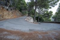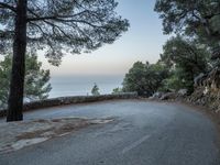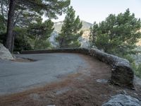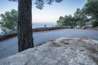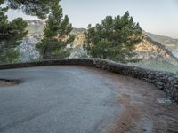 A top down view of the switchback road winding through the coastal landscape of Mallorca, one of the Balearic Islands off the coast of Spain in Europe. Clear skies and a high mountain view provide an elevated perspective on nature and the ocean below.