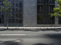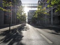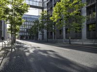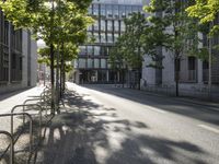 A monochrome snapshot of Berlin, Germany's metropolitan area, featuring the city's infrastructure and modern architecture illuminated by the morning sun, as vehicles, bicycles, and benches line a street flanked by trees and condominiums.