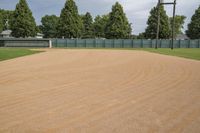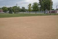 A baseball field in the small town of Bancroft, Iowa, surrounded by a grassy plain, open space, grey sky and trees. A road surface, path, and asphalt structures provide access to the recreational space, inviting visitors to explore the USA's natural beauty.