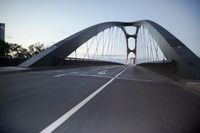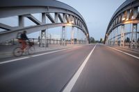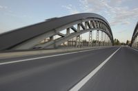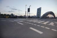 The dawn sky and the city of Frankfurt, Germany provide a breathtaking backdrop to the highway, including a cable-stayed bridge, crosswalk, and other infrastructure. This morning, the road was filled with a mix of pedestrian, cycling, and motor vehicles, all heading straight down the road on a road trip.