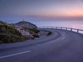 The sun rises over the coastal landscape of Mallorca in the Balearic Islands, Spain, as a winding road curves around an armco barrier and guard rail.