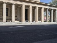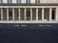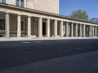 A view of Neues Museum in Berlin, Germany, a tourist attraction with classic architecture and urban design. The sunlit walkway with a symmetrical arcade of columns, a palace, and a Roman temple in the foreground showcases the beauty of the city's urban life and ancient material properties. With a blur of motion and light, the road is straight down the aisle to the entrance door.