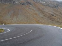 Travelling down the winding asphalt road, through the open landscape of the Timmelsjoch mountain pass in Austria, a grey sky and the occasional rain shower reveal the beauty of the nature and the curve of the switchback road.