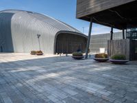 A composite material road surface curves around the vegetation of the Netherlands. The facade of a high-rise condominium is illuminated by the sun and framed by a mix of modern architecture, urban design, and infrastructure. A parking lot, street light fixture, and restaurant are all part of the urban landscape, with grey brick and wood providing contrast against the clear sky.