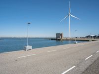 A motor vehicle tire rolls along the road surface on a calm, clear day in Holland. The azure sky is dotted with cumulus clouds and the natural environment features grass, trees, and a coastal wind turbine in the background.