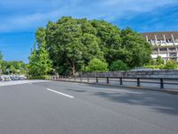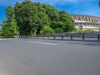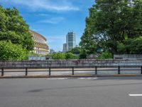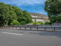A view of Tokyo's urban landscape during the day, including an office building, a road, and a sports stadium in the distance.