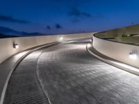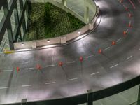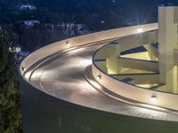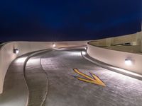 A one quarter elevated view of a curved concrete road in a parking garage in the suburbs of Los Angeles, USA lit by artificial light in the break of day.