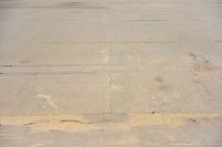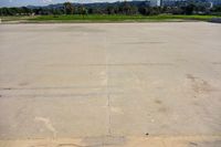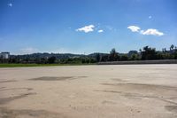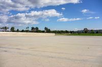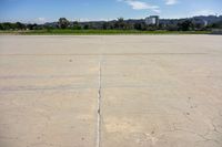 A top down view of Los Angeles, California, USA showing the elevated concrete surface and open spaces surrounded by clouds on a sunny day.