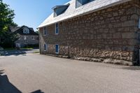 A residential house in Toronto, Canada, surrounded by vegetation and a clear sky. The grey asphalt road surface leads to the straight driveway entry, with a hard shadow cast by the building's facade and windows.