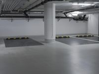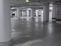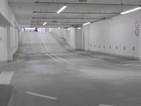 A straight line of concrete road with parking lot and parking deck can be seen in the urban area of Hamburg, Germany. The white polished tile flooring and black text design of the building's interior blend with the metal and cement surfaces of the infrastructure. The open space, park, and human settlement of this metropolitan city create a unique atmosphere of modern European architecture.