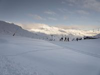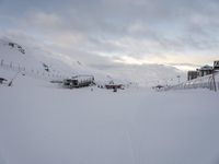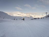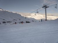 A winter scene of the Alps in France, Europe, with a mountain range, snow-covered terrain, a gondola, trees, and a track in the foreground. The clear sky and the morning light shows the beauty of the glacial mountain landforms, a popular tourist attraction and recreational ski area, during the break of day.