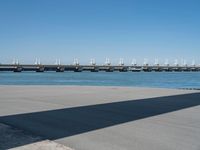 A view of the coastal landscape of Holland, with its asphalt roads, wind turbines, windmills, and bridges. The shore of the azure lake reflects the clear sky and the trees cast a hard shadow on the shore. The fluid ocean and its waves can be seen in the horizon, while the parallel lines of the fixed link and the jetty create a sense of symmetry and urban design.