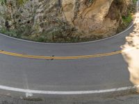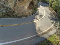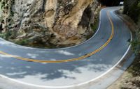 The S-curve of the high-elevated road weaves through the rural landscape, winding through the rock walls and nature, motion-blurred in the day's hard shadow.