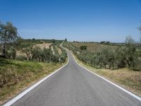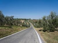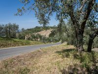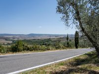 An asphalt road winds its way through the rural Tuscan landscape of Italy, Europe, with clear skies above and garden of olive trees below.
