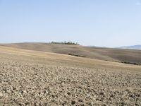 A clear sky provides a perfect backdrop to a rural landscape in Tuscany, Italy. The soil and gravel surface of the desert-like plain is scattered with sand, dirt and trees, and the natural environment provides the perfect setting for a harvest or garden.