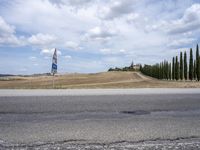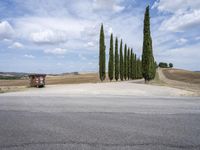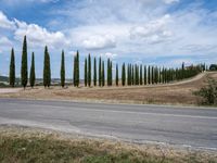 A view of the winding road along the rural landscape of Tuscany, Italy. The asphalt thoroughfare winds its way through the lush vegetation of the cypress family and open fields, framed by the woody plants and shrubs against the backdrop of the bright blue sky.