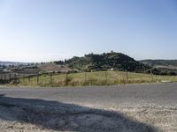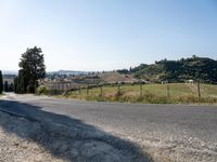 An overview of a rural landscape in Tuscany, Italy, featuring a winding road, rolling hills, trees, a clear sky, and a garden of harvested plants. The infrastructure of the road surface, land lot, and thoroughfare create a unique line profile that gives an idyllic view of nature in Europe.