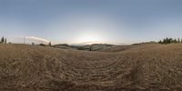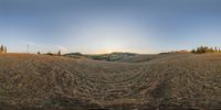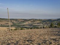 The picturesque view of the rugged landscape of Tuscany, Italy, with its open grassy plains, hills, trees, and clear sky, provides a glimpse into the natural environment of the European farm and harvest land.