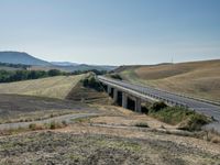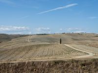 A grass and tree-filled landscape of a rural lot in Tuscany, Italy. A clear sky, rolling hills, and a rugged natural environment create a peaceful atmosphere amidst the harvest gardens and cypress trees.