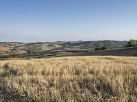 A rural landscape of Tuscany, Italy, featuring a field of grass, lush trees, and rolling hills, all beneath a clear blue sky and contrails in the distance. This natural environment is full of pastures, prairies, wilderness, and wilderness, with a harvest of grass and soil below.