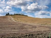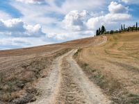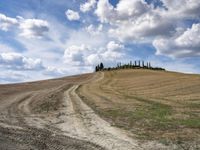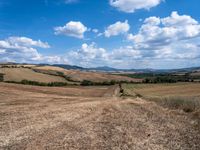 A scenic drive through the rolling hills and open fields of Tuscany, Italy. The dirt road leads to a magnificent landscape of rugged mountains, grassy plains, and abundant trees, offering a glimpse into the natural beauty of the region.