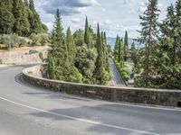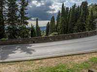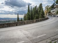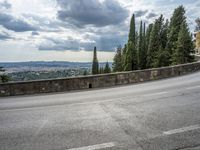 A view of the cityscape of Florence, Italy, showing a road with asphalt in the foreground, surrounded by trees and nature in the background. The infrastructure of the thoroughfare stretches out across the landscape of the European city, with a garden in the foreground and clouds in the sky.