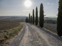A peaceful landscape of a rural road in Tuscany, Italy, with a clear sky, gravel surface, and lush vegetation. The sun is visible in the horizon and the rocky mountain in the background gives a rugged charm to the scene.
