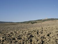 The vast, rugged landscape of Tuscany, Italy, with its rolling hills, clear blue sky, and natural environment of steppes, fields, and vegetation, is a stunning example of the beauty of the European continent's diverse geology.