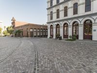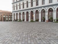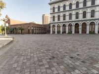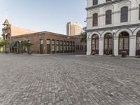 The classic architecture of Los Angeles, California, USA is illuminated by the morning sun, revealing the cobblestone plaza and the many restaurants and hotels that make up the urban landscape.
